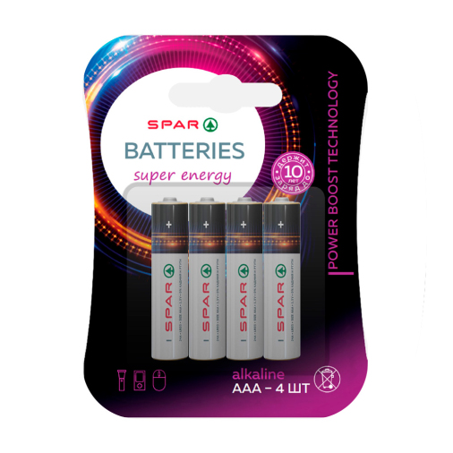 Батарейки SPAR формата ААА — отличный выбор для пультов, игрушек, часов и других бытовых приборов. Обеспечивают стабильную работу различных устройств, поддерживая их автономность. В комплекте 4 штуки.