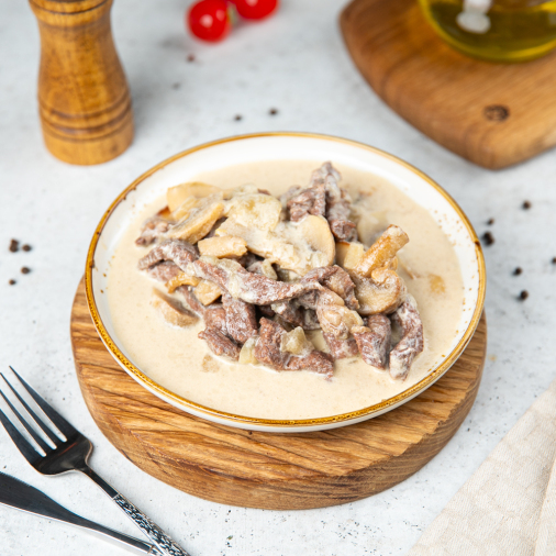 Говядина по-строгановски – это нежные кусочки мяса, томленные в густом французском соусе бешамель с ароматными специями. Пикантности блюду придают мелко порезанные шампиньоны. Чеснок и тимьян добавляют вкусу выразительности. Идеальный выбор для приготовления изысканного ужина или дополнения к любому гарниру.