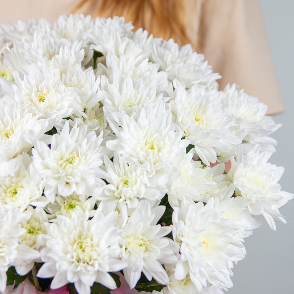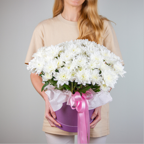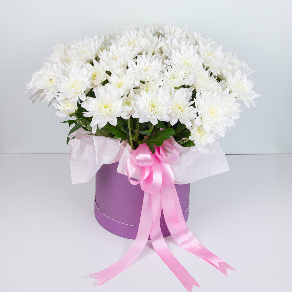 Нежные, свежие, белоснежные, эти хризантемы – воплощение чистоты, невинности, неискушенности. Они такие трогательные и милые, что способны привести в восторг как юную барышню, так и зрелую леди. Цветы в коробке не помнутся и не завянут.