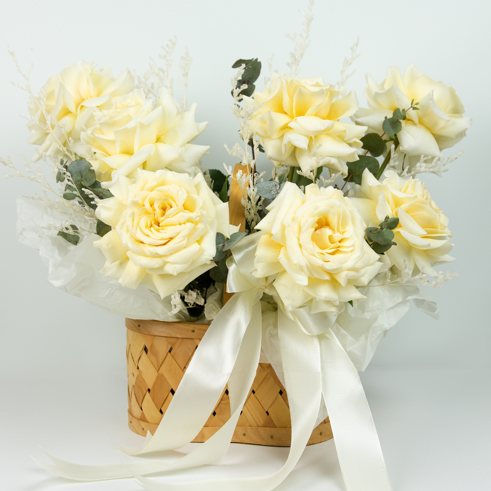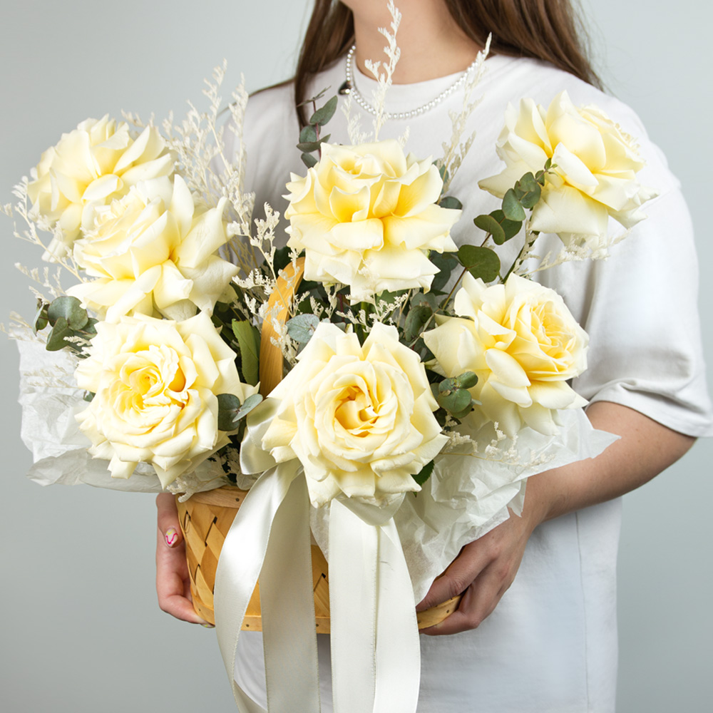 Крупные шапочки белых французских роз в компании ароматного эвкалипта – то, что нужно для романтического свидания. Корзина роз – прекрасная, оригинальная альтернатива классическому букету, ведь она выглядит по-особенному романтично и трогательно.