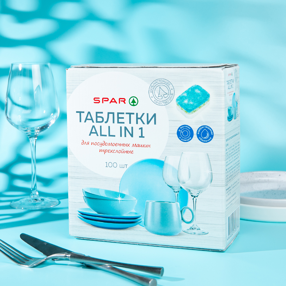 Водорастворимые таблетки для посудомоечных машин SPAR эффективно удаляют загрязнения и придают посуде блеск. Подходят для очистки посуды от разных видов остатков пищи. Обеспечивают качественное мытьё и помогают защитить посудомоечную машину от известкового налёта.