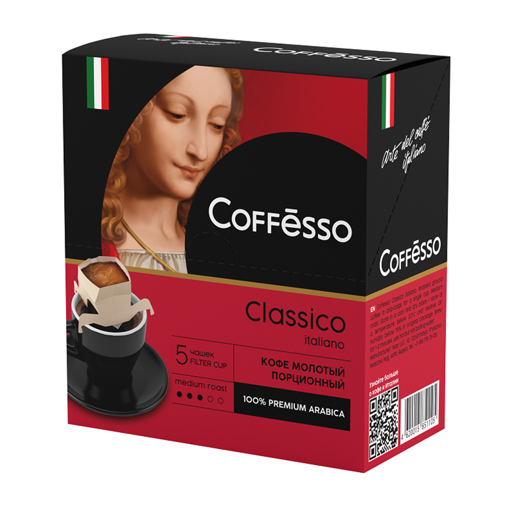Натуральный кофе Coffesso Classico Italiano в дрип-пакетах — удобный выбор для ценителей итальянского вкуса. В упаковке 5 порций свежемолотого кофе, готового к завариванию. Насладитесь насыщенным ароматом и богатым вкусом, просто заварите кофе кипятком прямо в дрип-пакете. Идеален для утреннего кофе или в течение дня, когда хочется сделать перерыв и насладиться качественным напитком.