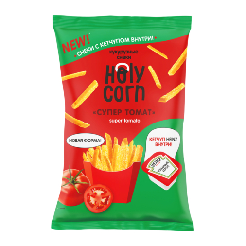 Кукурузные снеки Holy Corn супер томат с кетчупом — отличный выбор для быстрого перекуса или закуски к напиткам. Они имеют яркий вкус и хрустящую текстуру, которая понравится взрослым и детям. Попробуйте добавить их в салаты или использовать как топпинг для супов.