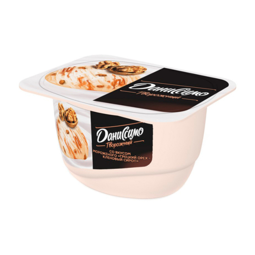 творог обезжиренный, сливки, обезжиренное молоко, сахар, наполнитель (сахарный сироп, грецкий орех дробленый, стабилизатор – Е1442, молоко цельное сгущенное с сахаром, ароматизаторы, регуляторы кислотности – лимонная кислота, цитраты натрия, кленовый сироп, карамелизованный сахарный сироп). Может содержать следы глютена, соевого лецитина, орехов (помимо указанных в составе).