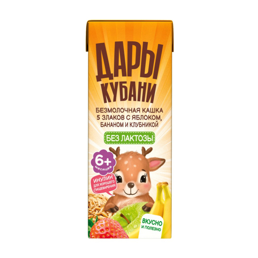 Вода, концентрированный яблочный сок, пюре банановое, мука кукурузная, мука пшеничная, мука овсяная, масло кукурузное, пюре клубничное, мука рисовая, мука гречневая, пребиотик-инулин, мальтодекстрин.