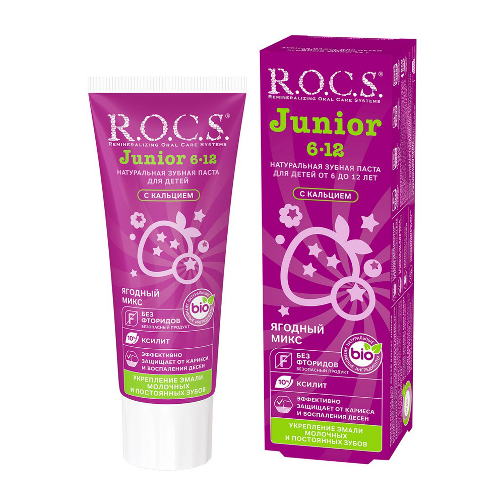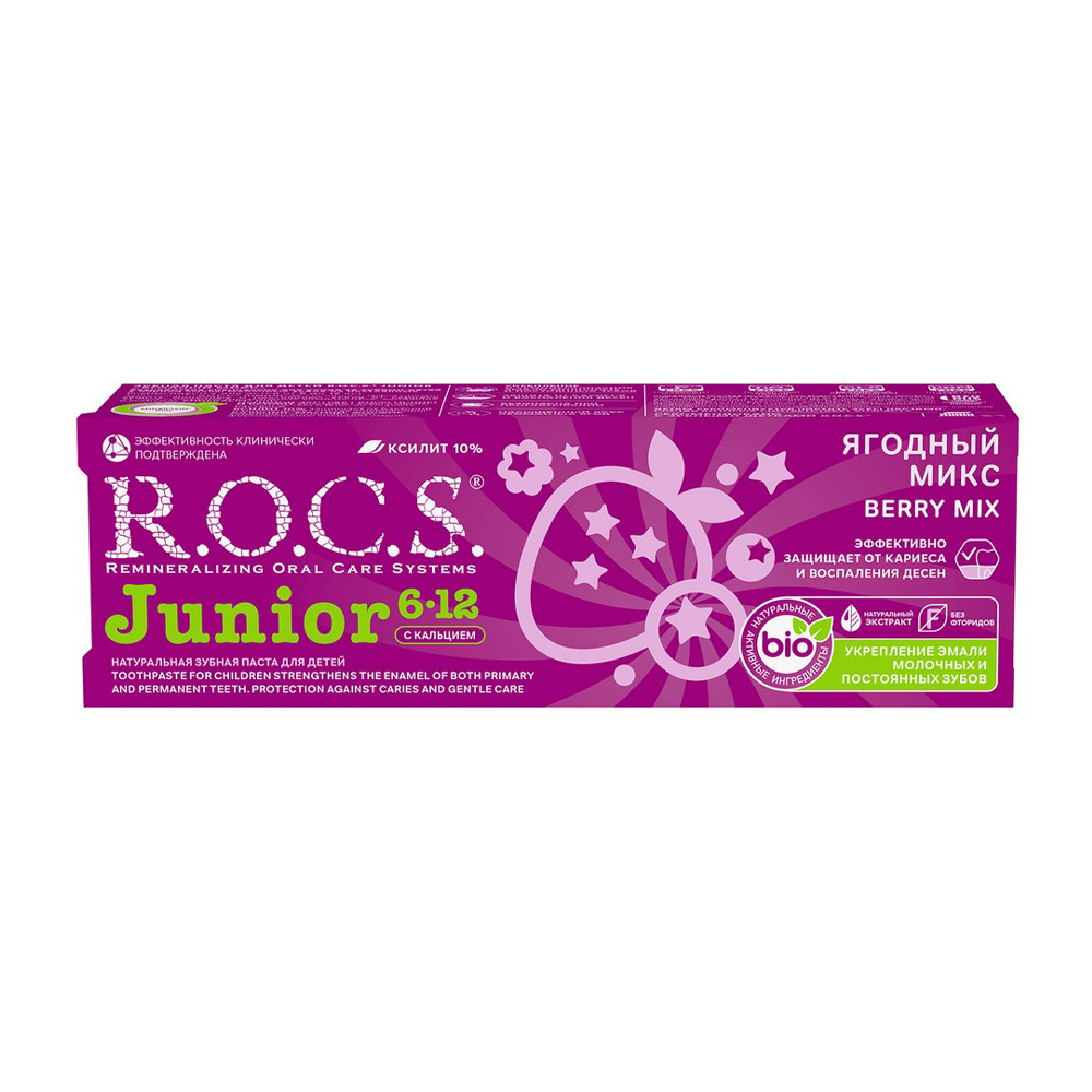 Зубная паста R.O.C.S. Junior Ягодный микс предназначена для детей от 6 до 12 лет. Она помогает бережно очищать зубы и заботится о полости рта. Паста обладает приятным ягодным вкусом, который понравится малышам. Используйте её дважды в день для здоровой и сияющей улыбки вашего ребёнка.