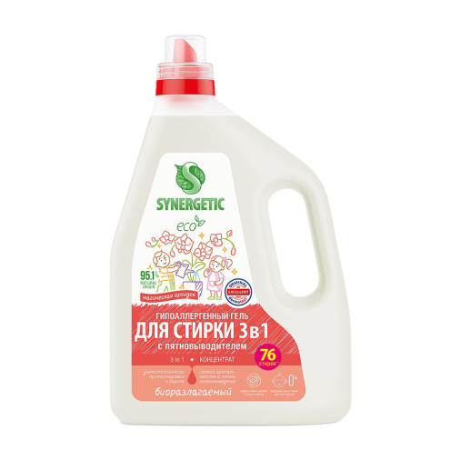 Эффективное средство для стирки любых тканей — гель Synergetic Магическая орхидея. Объём 2,28л обеспечит достаточное количество стирок. Гель бережно отстирывает загрязнения, сохраняя цвет и структуру ткани. Подходит для ручной и машинной стирки.