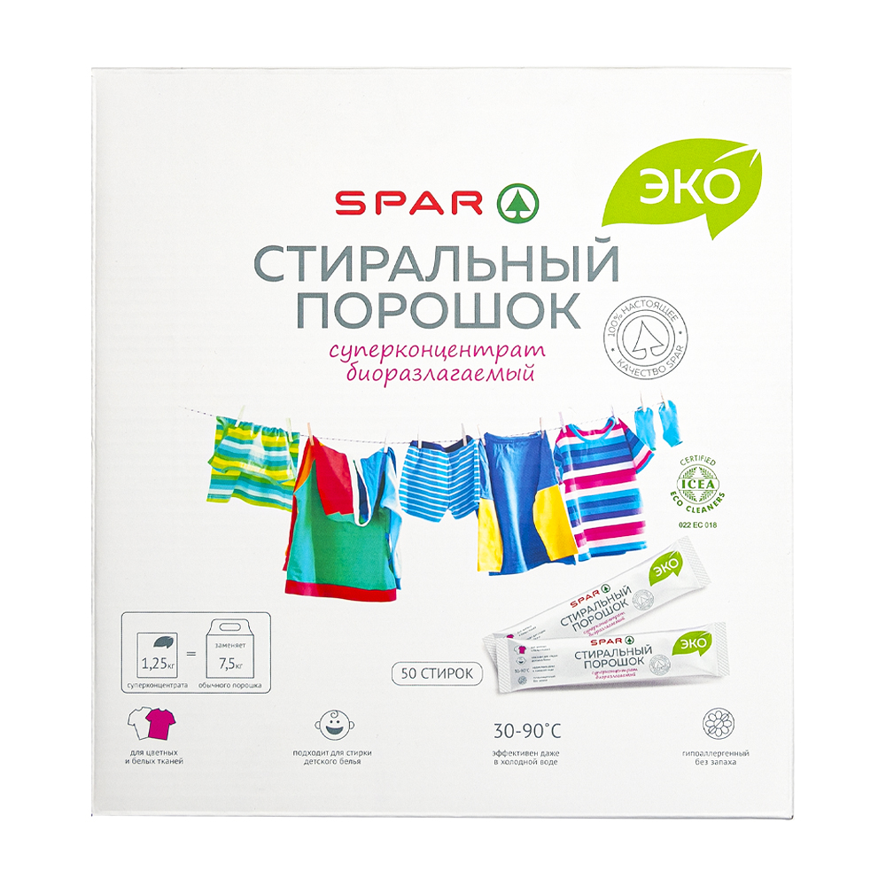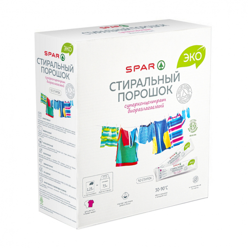 Главный по чистоте ваших вещей – стиральный порошок SPAR Эко. Благодаря своей гиппоаллергенной формуле не вызывает раздражения кожи и подходит для стирки детских вещей. Быстро и эффективно удаляет загрязнения даже в холодной воде, при этом не нарушает структуру волокна, прекрасно вымывается из ткани. Не имеет запаха. Подходит для цветных и белых вещей.