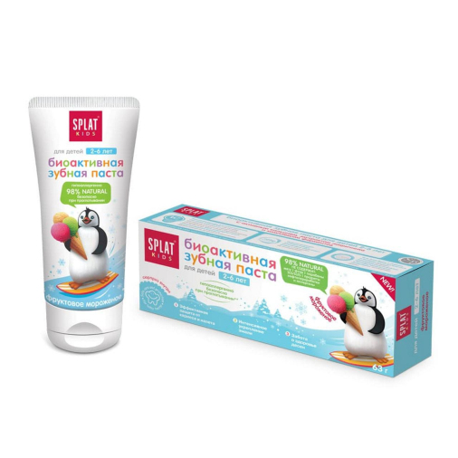 Зубная паста Splat Kids Фруктовое мороженое предназначена для детей от 2 до 6 лет. Она поможет приучить малышей к гигиене полости рта и сделает процесс чистки зубов приятным и весёлым. Паста обладает нежным вкусом фруктового мороженого, который понравится детям.