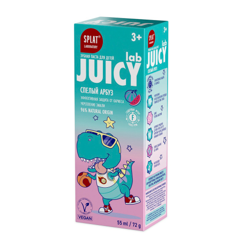 Клинически доказано, что детская паста Splat Juicy Lab бережно очищает, глубоко восстанавливает и укрепляет твердые ткани зубов, эффективно защищает от кариеса и налета. 96% натуральных компонентов, среди которых: волшебный фтор - 1000ppm, папаин, экстракт лакричника и цинк. Вкус спелого арбуза окунет в солнечное лето и наполнит день яркими эмоциями. А еще она с блестками!