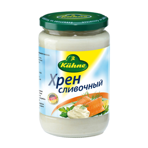 Хрен тертый, масло рапсовое рафинированное дезодорированное (22 %), взбитые сливки (10 %), спиртовой уксус, вода, глюкозно-фруктозный сироп (глюкоза, фруктоза), сахар, молочная сыворотка, соль, загустители: гуаровая камедь, ксантановая камедь; регулятор кислотности: лимонная кислота; антиокислитель: пиросульфит натрия; краситель: диоксид титана; натуральный ароматизатор: лимон.