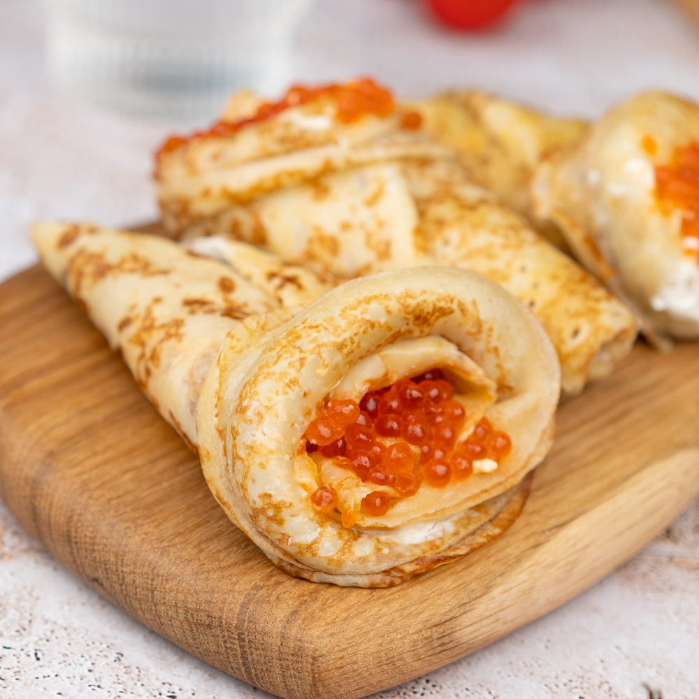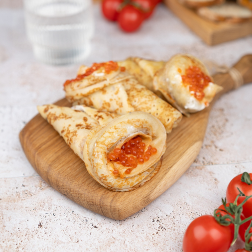 Какие ещё блинчики можно назвать блинчиками по-русски как не те, внутри которых красная икра? А если подать их с нежным сливочным маслом или сметаной? Уверены, что аппетит проснется у любого!