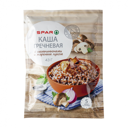 Где берётся сила богатырская? В сытной и аппетитной гречневой каше с добавлением шампиньонов и жареного лучка. Не требует длительного приготовления, просто залейте горячей водой, подождите 5 минут, и блюдо в лучших традициях русской кухни готово. Добавьте зелень по вкусу.
