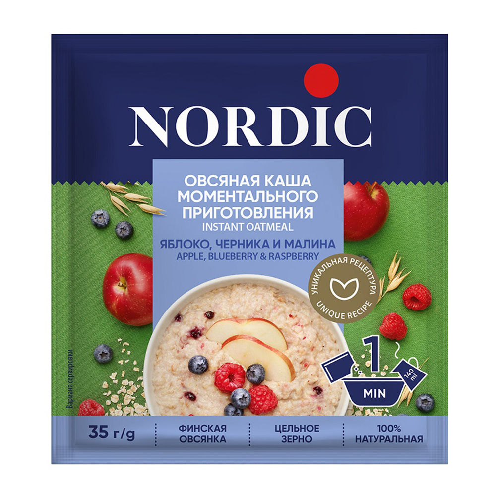 Овсяная каша Nordic с яблоком, черникой и малиной — идеальный выбор для быстрого и вкусного завтрака. Просто добавь горячей воды — и через пару минут получишь аппетитное блюдо. Каша обеспечит тебя энергией на весь день и порадует нежным фруктовым вкусом. Отличный старт для активного утра!