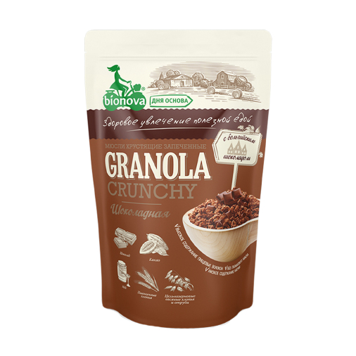 "Запеченная шоколадная гранола - ароматный, вкусный и полезный завтрак со злаками и настоящим бельгийским шоколадом. Запеченные злаки содержат клетчатку – растительное пищевое волокно, которое нормализует работу пищеварительной системы, а в сочетании с темным шоколадом помогает избежать стрессов и активизирует жизнедеятельность всего организма. Готовы к употреблению. По желанию можно добавить молоко, йогурт или сок.