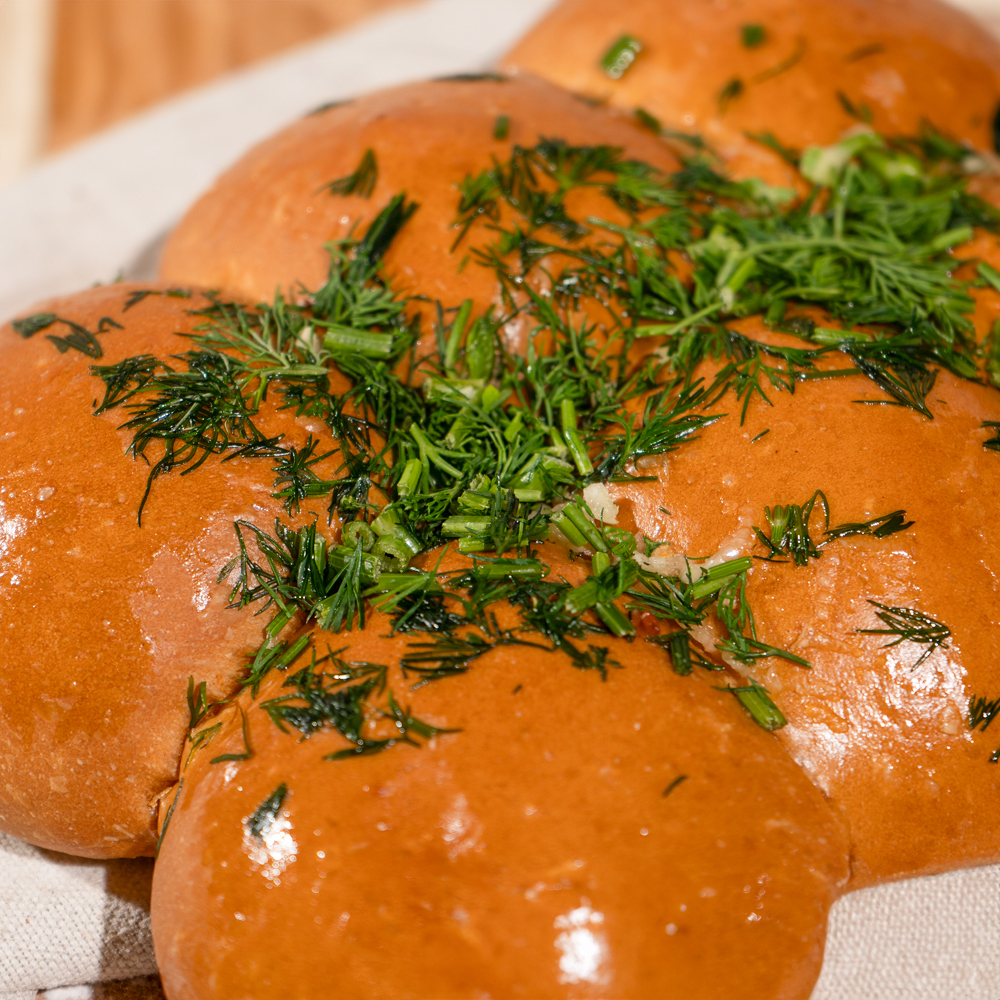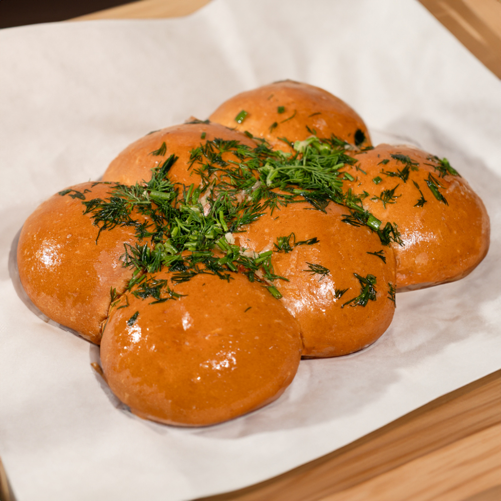 Мука пшеничная, вода, яйцо, маргарин (масло подсолнечное, пальмовое, кокосовое, вода, глицериды жирных кислот, сорбат калия, лимонная кислота, куркумин, ароматизатор), смесь ванильная (мука в/с, сыворотка молочная сухая, пищевая добавка (эмульгатор: Е472е, носители: Е341iii, Е170), ароматизатор, эмульгатор Е481, антиокислитель Е300, ферментные препараты) )микробного происхождения сахар, масло подсолнечное, чеснок, укроп, соль, дрожжи.