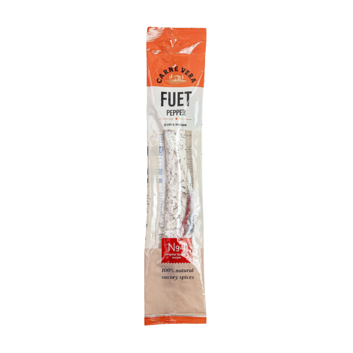 Фуэт с перцем — это сыровяленая испанская колбаса из свинины тонкой формы, покрытая благородной белой плесенью и с добавлением перца для придания остроты. У нее плотная, упругая структура, насыщенный острый вкус, ароматная пряная композиция и красивый узор среза. Фуэт используют как самостоятельную закуску, так и в бутербродах, сэндвичах, салатах, на пицце и в горячих блюдах