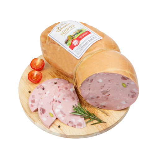Свинина, телятина, вода, шпик, языки свиные, меланж яичный, посолочная смесь (соль поваренная пищевая, фиксатор окраски: нитрит натрия), фисташки, стабилизатор: пирофосфаты, сахар-песок, пряности: перец черный молотый, орех мускатный, усилитель вкуса и аромата:глутамат натрия, антиокислитель – аскорбиновая кислота.