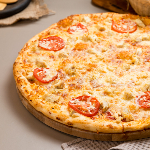 Румяная курочка под нежным сливочным соусом, с ломтиками томата и тертым сыром на воздушном и тонком тесте. Пицца, которая сделает ваш вечер по-настоящему сытным и очень вкусным.
