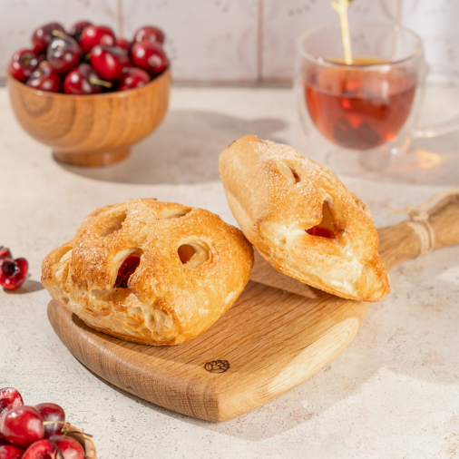 Мягкая, пышная, воздушная слойка с хрустящей корочкой и тающей во рту кисло-сладкой начинкой из натуральной вишни. Возьмите к завтраку или для семейного чаепития.