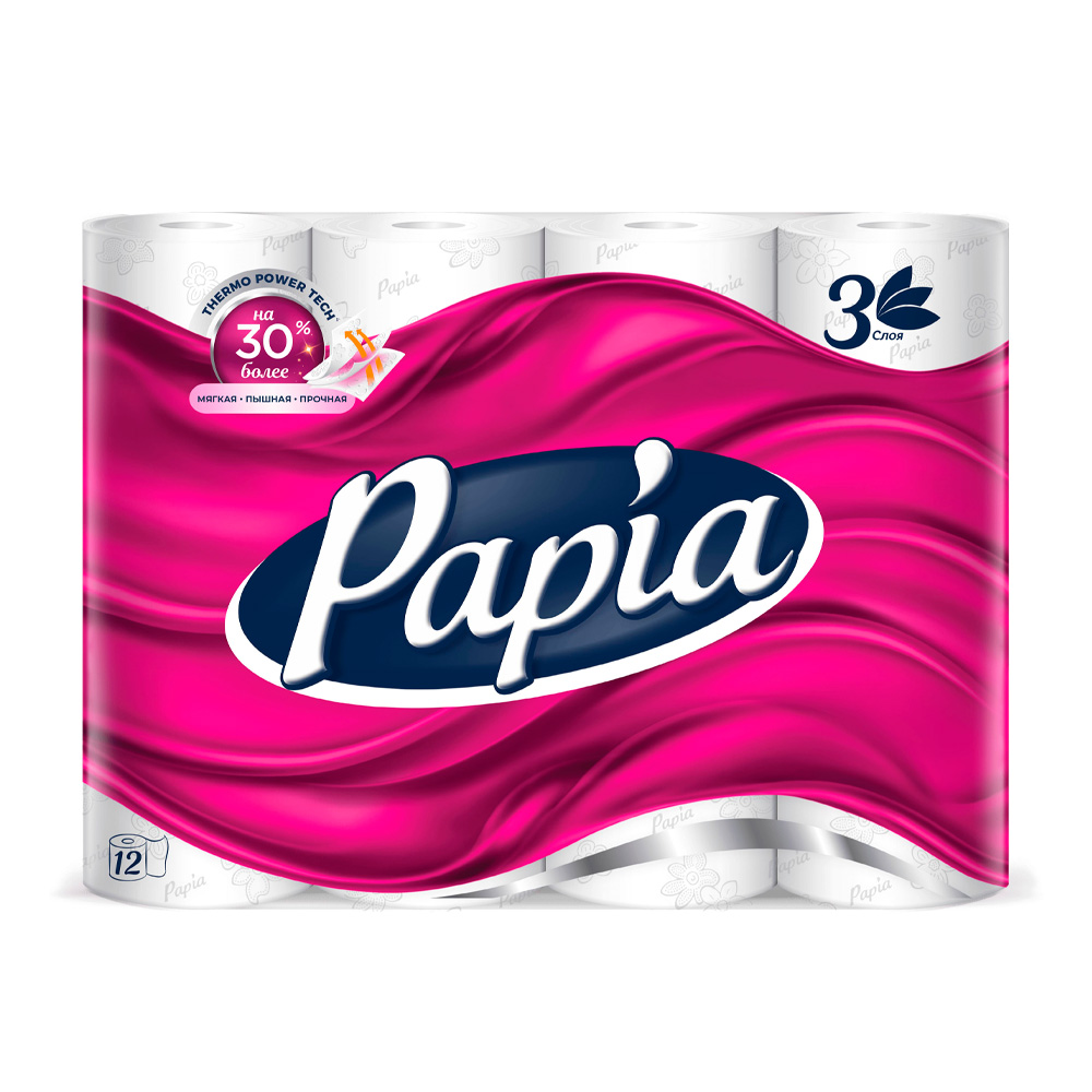 Белая трехслойная бумага Papia с экстрактом хлопка необыкновенно мягкая и в то же время прочная. Уникальная технология двустороннего тиснения бумаги обеспечивает лучшую впитываемость и мягкость с обеих сторон.