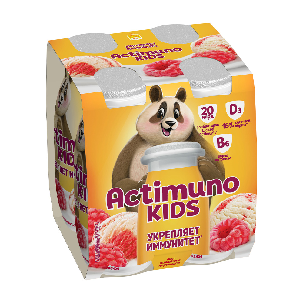 Молоко нормализованное, сахарный сироп (сахар, вода), наполнитель (вода; сахар; стабилизатор – Е1442; концентрированный сок красной свеклы; ароматизаторы натуральные; пюре малины; концентрированный лимонный сок; краситель – экстракт паприки; витамин D3), глюкоза, йогуртовая закваска, лактобактерии L. сasei Actimunis*, витамин D3, витамин B6. Количество молочнокислых микроорганизмов – не менее 1х107 КОЕ/г. Количество лактобактерий L. сasei Actimunis* – не менее 2,2х108 КОЕ/г.