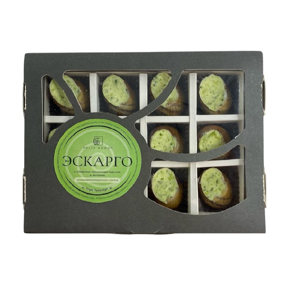 Улитка Helix Aspersa Maxima, масло сливочное 72,5%, зелень, чеснок, соль.