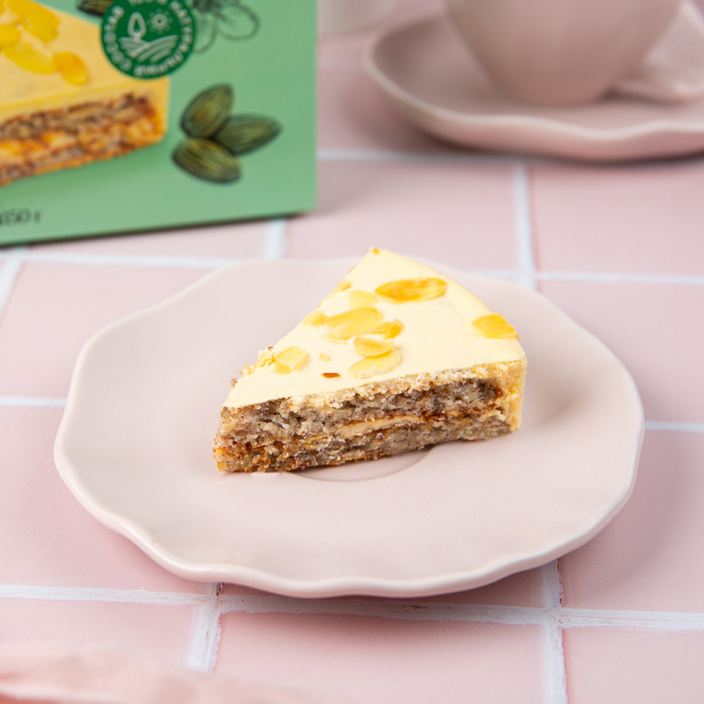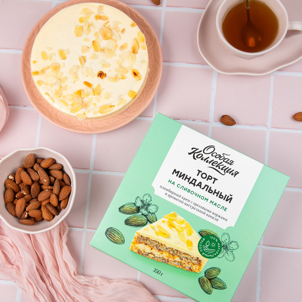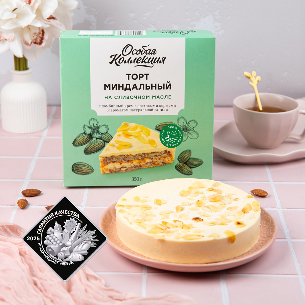 Замороженный торт Особая коллекция миндальный — это изысканное лакомство, которое станет украшением любого стола. Нежный вкус и аромат миндаля подарят незабываемые ощущения. Идеальный выбор для праздничного чаепития или уютного вечера в кругу близких. Прекрасно подойдёт для угощения гостей или в качестве сладкого подарка.
