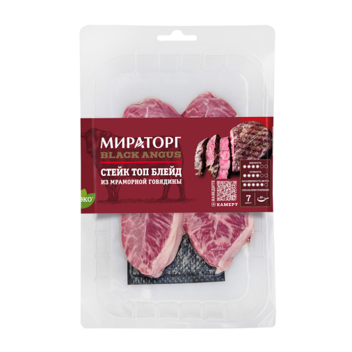 Стейк Топ Блейд из мраморной говядины Black Angus вырезается из блейда, который выделяется из лопаточной части. Сочный и нежный альтернативный стейк, лишь немного уступающий по своим характеристикам премиальным стейкам. В приготовлении также прост, как и другие стейки. Подробный рецепт размещен на обратной стороне этикетки.