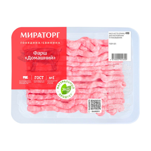 Нежный фарш из отборной говядины и свинины — мясная классика, из которой получаются всеми любимые блюда вроде домашних котлет, запеканок, чебуреков, фаршированных перчиков. Фарш Мираторг изготовлен в соответствии с ГОСТ, в нем только натуральное мясо — и ничего больше.