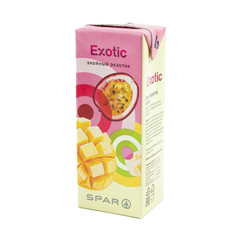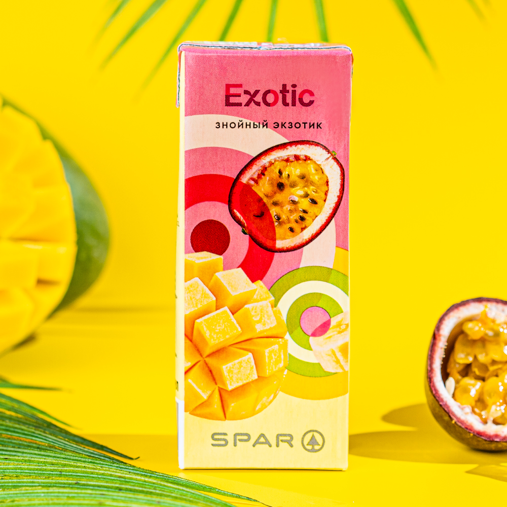 Нектар SPAR Экзотик — это освежающий напиток с ярким вкусом, который подарит ощущение тропического лета. Он идеально подходит для создания оригинальных коктейлей, фруктовых салатов и десертов. Нектар также можно пить в чистом виде в качестве полезного перекуса для детей и взрослых.