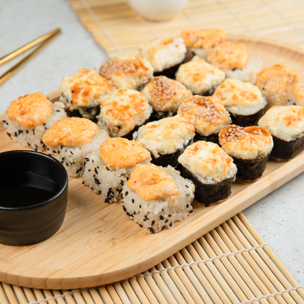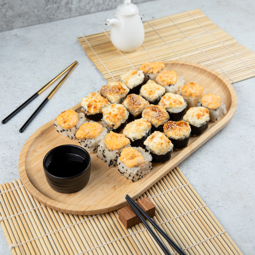 Это яркое сочетание традиционных японских роллов с оригинальными ингредиентами. Каждый ролл наполнен разными начинками: филе курицы и горбуши придают мясистую сочность, огурцы и перец добавляют свежесть, ананас дарит сладость, а творожный сыр и майонез обеспечивают кремовую текстуру. Завершают композицию изысканные акценты — соус унаги, кунжут, водоросли.