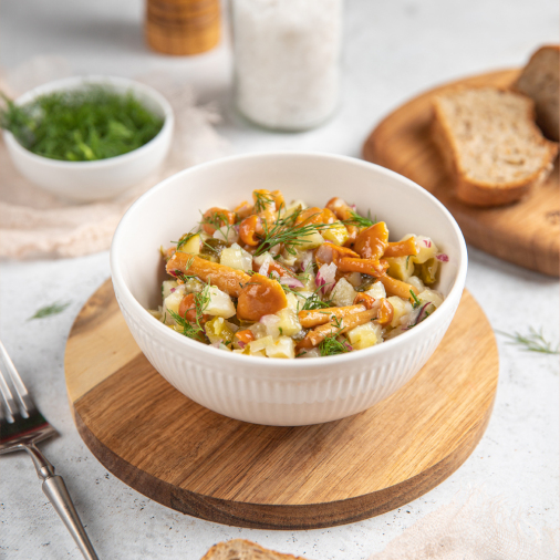 Аппетитный салат из отварного картофеля, хрустящих маринованных огурцов, сладкого красного лука и зелени. Самую главную роль здесь играют маринованные опята, которые придают блюду легкую приятную терпкость и пряность. Заправляется салат оливковым маслом, чтобы вы по достоинству могли оценить его оригинальный вкус.