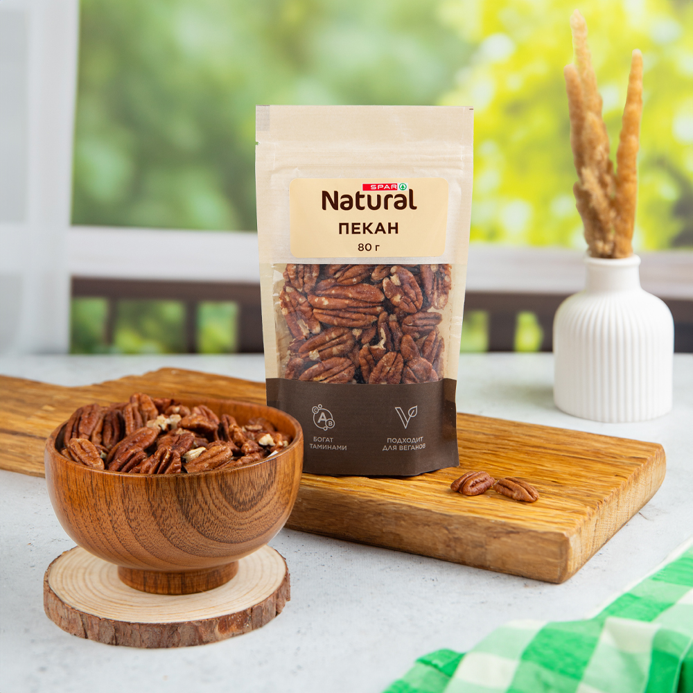 Сушеный пекан SPAR NATURAL — идеальный выбор для любителей орехов. Вес упаковки — 80г. Этот орех обладает насыщенным вкусом и хрустящей текстурой. Подходит для добавления в салаты, десерты и выпечку, а также как самостоятельный перекус. Сушеный пекан обогатит ваше меню и подарит наслаждение от каждого укуса.