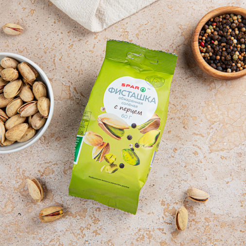 Крупные обжаренные фисташки с морской солью и ароматным черным перцем для тех, кто любит оригинальное. Во вкусе — узнаваемая ореховая сладость ядра фисташки, деликатно подчеркнутая ароматной перечной остринкой. Их можно подавать в качестве классического снека и брать с собой на перекус или в дорогу.