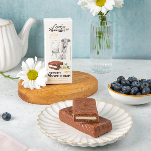 Секрет потрясающего вкуса десерта «Особая Коллекция» – это ингредиенты! Мы делаем выбор в пользу натурального творога и молока. Так создается восхитительное лакомство, поражающее своей сладостью. Эту любовь подкрепляет мягкая, нежная ванильная начинка, а тонкий шоколадный бисквит усиливает это чувство вдвойне, обрамляя ее с двух сторон.