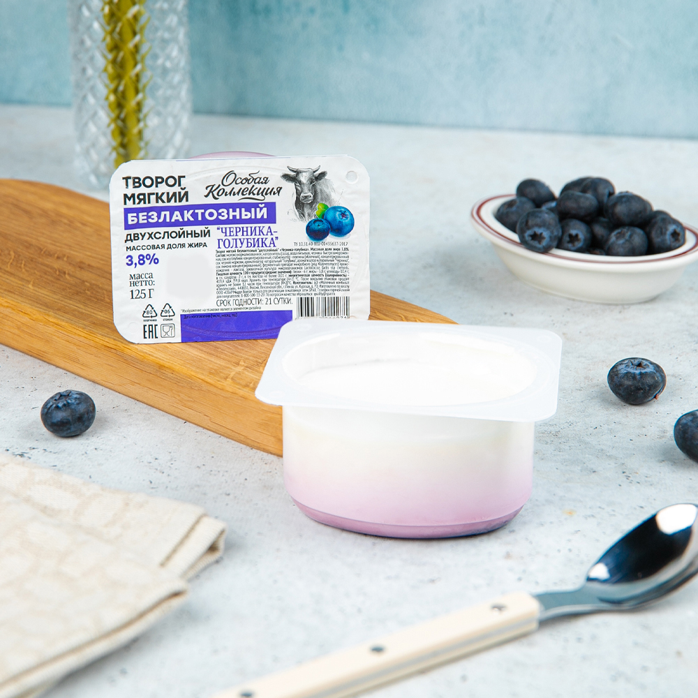 Безлактозный творог Особая коллекция с черникой и голубикой — отличный выбор для здорового перекуса или десерта. Подходит для людей с непереносимостью лактозы. Продукт удобно брать с собой благодаря компактной упаковке весом 125г. Творог можно использовать для приготовления запеканок, сырников или как начинку для блинов.