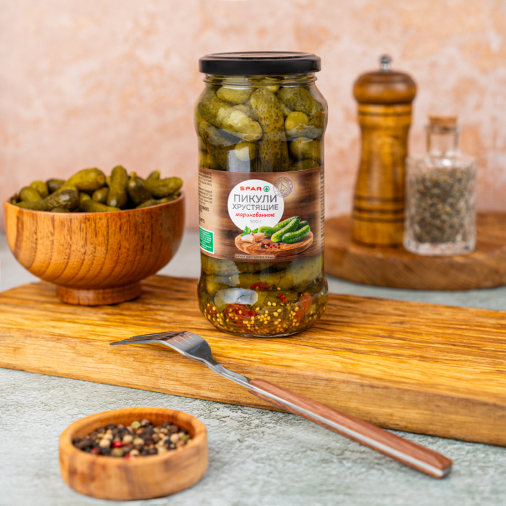 Пикули маринованные SPAR - деликатесные маленькие аппетитные корнишоны. Хороши на вкус! Отборные хрустящие огурчики и с любовью подобранный букет из зелени и специй украсят любое застолье.
