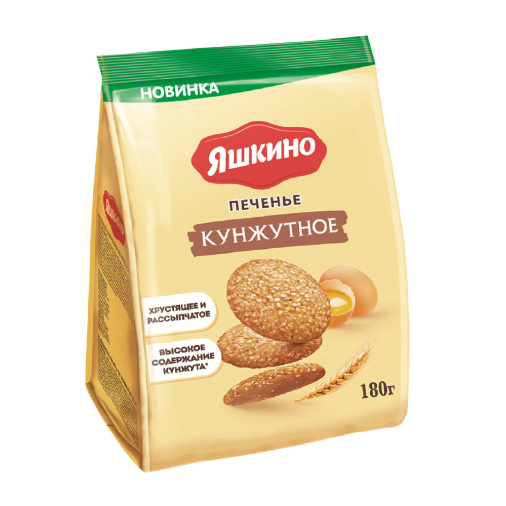 Кунжут, жир кондитерский (рафинированные дезодорированные растительные масла в натуральном и модифицированном виде, эмульгатор моно и диглицериды жирных кислот, антиокислители: аскорбиновая кислота, альфа-токоферол), сахар-песок, мука пшеничная хлебопекарная в/с, яйца куриные пищевые, вода питьевая, соль пищевая, краситель: Е150а, разрыхлители Е450, гидрокарбонат натрия, регулятор кислотности Е541. Не содержит ГМО.
