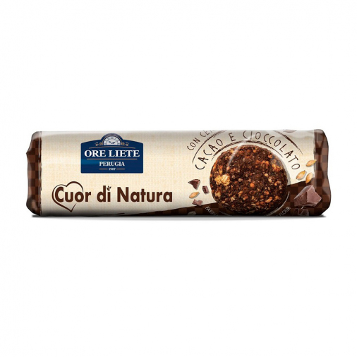 Цельнозерновая мука 29% (содержит глютен), сахар, овсяные хлопья 14%, подсолнечное масло 11%, карамелизованная пшеница 8% (пшеница, сахар, мед, подсолнечное масло), шоколад 8% (сахар, какао-масса, какао-масло, эмульгатор: соевый лецитин, натуральный ароматизатор ванили; какао мин.46%), какао-порошок 5%, карамелизованный рис 4% (слоеный рис, сахар, глюкозный сироп, подсолнечное масло), разрыхлители: гидрокарбонат аммония - гидрокарбонат натрия, динатрийдифосфат, гранулированный фундук 0,7%, соль, ароматизаторы. Может содержать следы молока, горчицы, яиц и других орехов.