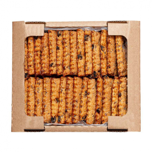 Крем на растительных маслах (сахар, вода, заменитель молочного жира, сыворотка, молочная кислота, соль, ароматизатор творог), мука пшеничная в/с, маргарин, лимонная кислота, изюм, сахар, семена подсолнечника и кунжута.