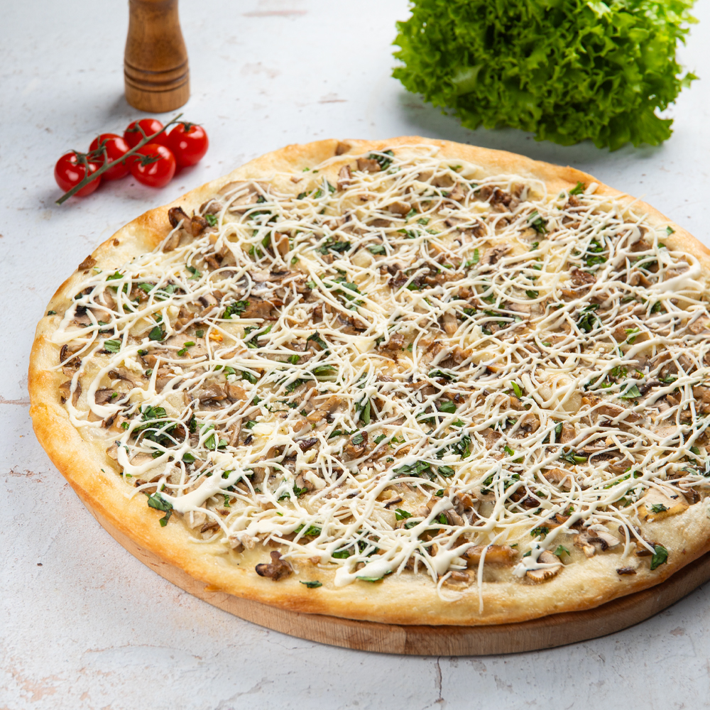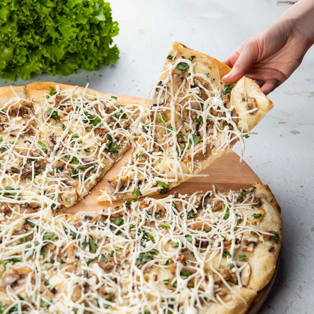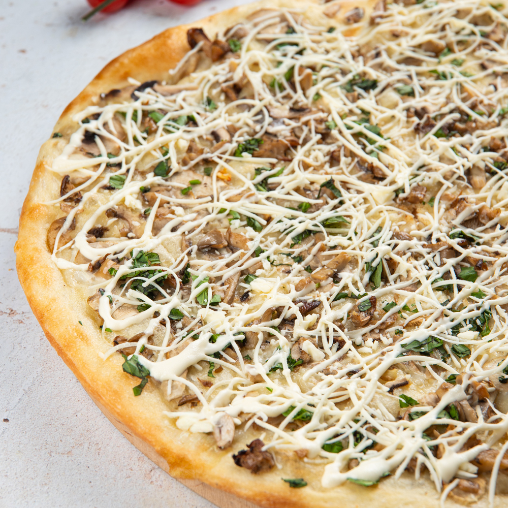 Мука пш в/с, дрожжи, вода, соль, сахар, масло подс, соевый сыр (соевые бобы, вода, сульфат кальция (пищевой коагулянт), майонез постный, вешенки, шампиньоны, базилик, специи, чеснок.