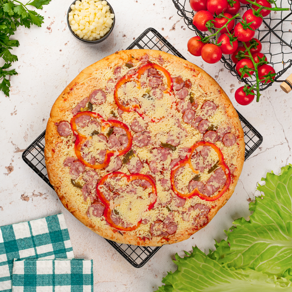 Классическая рецептура старинной Баварии! Сочные охотничьи колбаски, томатная паста, острый перец Халапеньо, кольца сладкого перца и красный лук на нашем фирменном тесте. Приготовление пиццы займёт всего несколько минут. Идеально для тех, кто ценит время и хочет порадовать себя и близких.