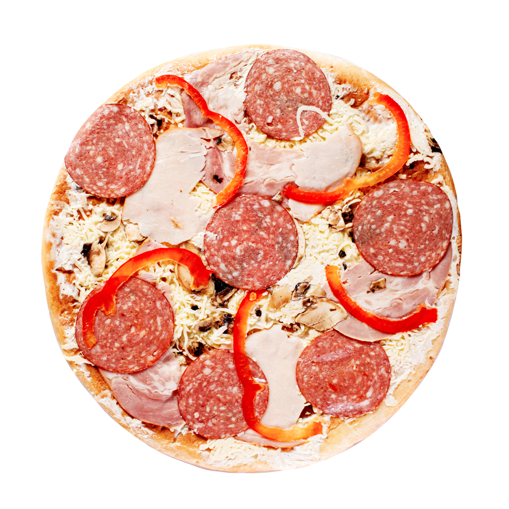 Сыр (молоко, соль, сычужн. ферм, хлорид кальция, мол. закваска, соль, масло слив, мол. белок, альбумин молочн, цитрат натр, бета-каротин), мука пш, вода, сливки, грудинка, сервелат, шейка св., перец болгарский, шампиньоны, лук красный репчатый, масло подсолн, соль, сахар, дрожжи, чеснок, перец черный.