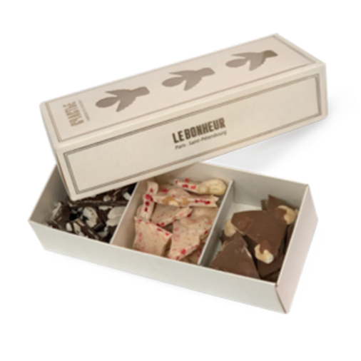Молочный шоколад 30% (сахар, сухое цельное молоко, масло какао, какао тертое, сухое обезжиренное молоко, эмульгатор: соевый лецитин, натуральный экстракт ванили), горький шоколад 72% (какао тертое, сахар, масло какао, эмульгатор: соевый лецитин; натуральный экстракт ванили), арахис, сахар, фундук, масло сливочное, сливки, инвертный сахарный сироп, миндаль, масло какао, сироп глюкозы, какао-порошок, молоко, кардамон порошок, соль, какао-бобы (крупка), кофе Содержание общего сухого остатка какао в горьком шоколаде 72% Содержание общего сухого остатка какао в молочном шоколаде -не менее 30,0%, содержание сухого обезжиренного остатка какао - не менее 4,0%, содержание сухого молочного остатка- не менее 26,0%, содержание молочного жира - не менее 6,5% Продукты могут содержать следы: орехов (кешью, грецкий, кедровый, пекан, фисташка), глютена, кунжута, яиц.