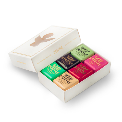 Молочный шоколад (сахар, цельное сухое молоко, масло какао, какао-тертое, сухое обезжиренное молоко, эмульгатор: соевый лецитин, натуральный экстракт ванили), горький шоколад (какао тертое, сахар, масло какао, эмульгатор: соевый лецитин, натуральный экстракт ванили), сахар, вафельная крошка (мука пшеничная, сахар, молочный жир, лактоза (молоко), молочный белок, cоль, экстракт солода (ячмень), разрыхлитель: сода пищевая), арахис, фундук, масло какао, кешью, тёмный шоколад (сахар, какао тертое, масло какао, эмульгатор: соевый лецитин, натуральный экстракт ванили), вишня, фисташки, цукаты имбирные (имбирь, сахар), крошка миндального печенья (мука пшеничная в/с, мука миндальная, сахар, масло сливочное, яйцо, соль морская), кунжут, семена чиа, ягоды годжи (ягоды годжи, сахар), сироп глюкозы, базелик, масло виноградное, масло сливочное, какао-порошок, молоко, агент желирующий: пектин, соль морская, имбирь молотый, кофе.
