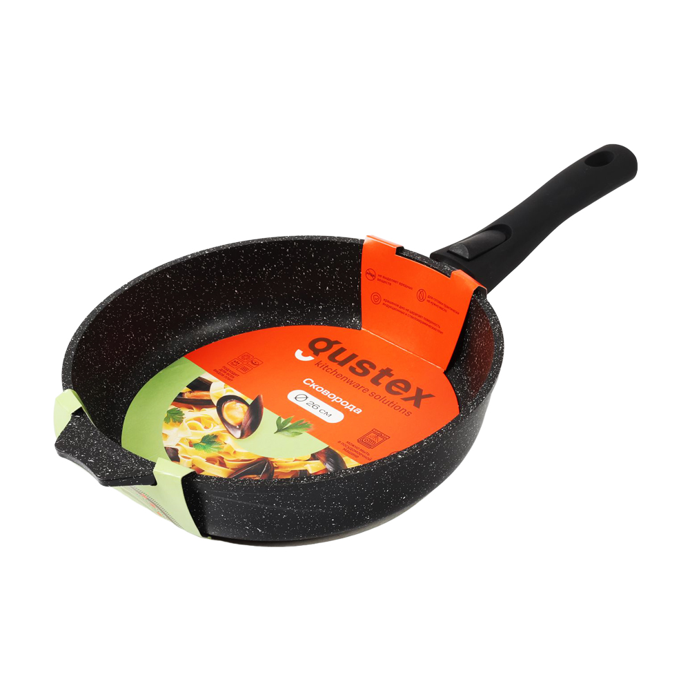 Gustex – посуда, разработанная экспертами для тех, кто готовит в удовольствие! Сверхпрочное утолщенное антипригарное покрытие премиум класса гарантирует долгую службу посуды, легкую очистку и помогает добиваться великолепного результата приготовления. Сковорода – настоящая помощница на кухне. Изготовлена из сверхпрочного алюминия, обладающего термоаккумулирующим свойством. Благодаря этому пища не пригорает, а томится, сохраняя всю пользу продуктов. Совместима со всеми типами варочных панелей, включая индукционные.