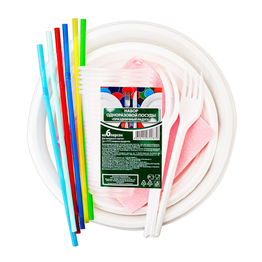 Тарелка 205мм, тарелка 170мм, вилка, салфетка, трубочка, стакан 200мл (полистирол,полипропилен, бумага).