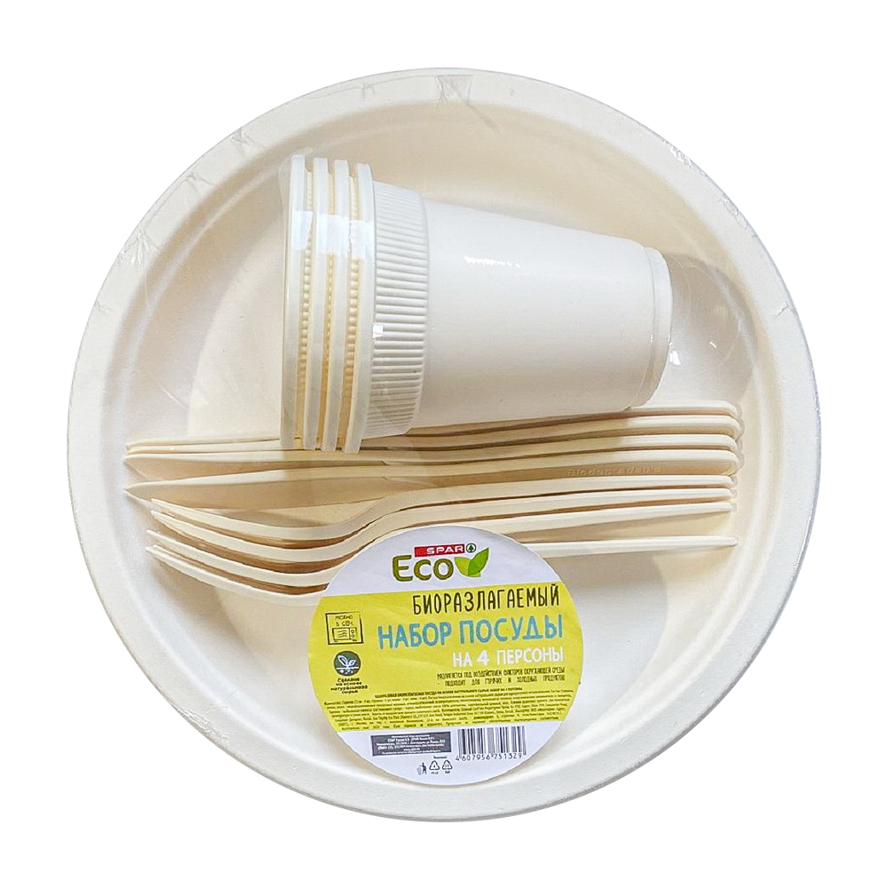 SPAR заботится о планете и предлагает вам приобрести Eco посуду, которая выполнена из натуральных материалов, подверженных разложению под воздействием факторов окружающей среды. Стильный набор на 4 персоны включает биоразлагаемую посуду, необходимую для гармоничного приема пищи.