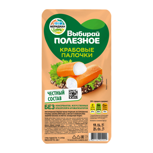 Крабовые палочки Меридиан Выбирай полезное — отличный выбор для лёгких закусок и салатов. Они идеально подходят для приготовления вкусных и свежих блюд. Попробуйте добавить их в салат или сделайте с ними рулеты — крабовые палочки придадут вашим кулинарным шедеврам неповторимый вкус.